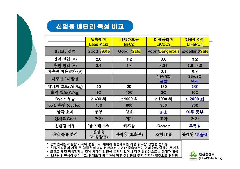 Lithium Iron Phosphate (LiFePO4, LFE) is new generation Li-Ion rechargeable battery for high power applications, such as EV car , Power Tool and RC hobby. LFP cells feature with high discharging current, non explosive, long cycle life ( >2000@0.2C rate, IEC Standard), but its energy density is lower than normal Li-Ion cell (Li-Co) (higher NiMH cell). LFP cell has 3.2V nominal working voltage and shall be cut-off power at 3.6-3.8V per cell during charging. Please see the table below to see comparison between LFP and other rechargeable batteries. LFP battery has the lowest cost if considering its long cycle life