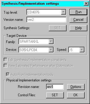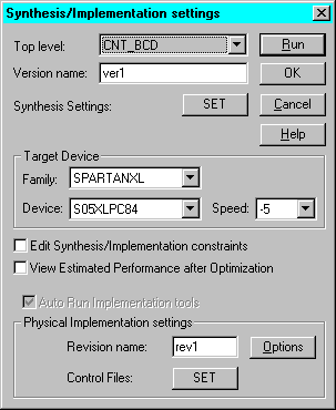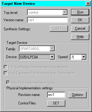 You can create a new version of the design by selecting Project Create Version. This accesses the Synthesis/Implementation settings dialog box (see theSynthesis/Implementation Dialog Box figure) where you can select the Top Level design, name the version, select a target device.