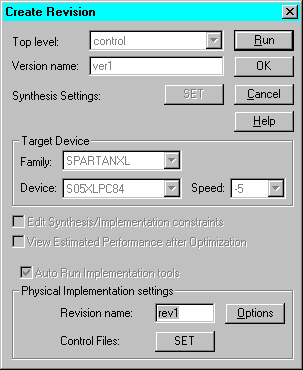 After the design has been synthesized, you can manually create a new revision for a version by selecting Project Create Revision. This accesses the Create Revision dialog box (shown below) where you can name the revision, set the implementation options, or choose to use a Guide or Floorplan file from a previous revision.