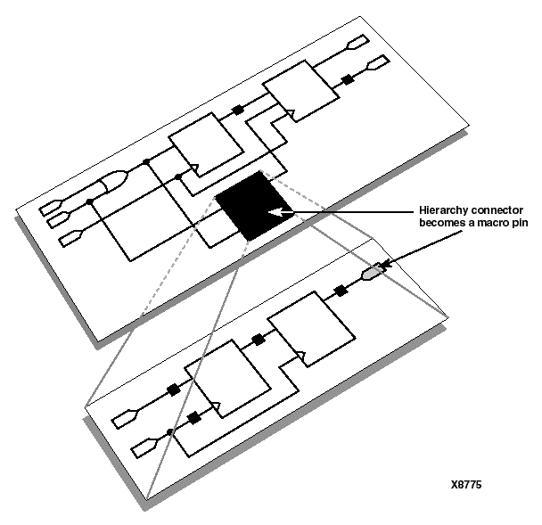 Since large number of symbols are used in FPGA and CPLD designs, handling large designs using the multi-sheet design structure can become very difficult and complex. Large designs typically require thousands of simple primitives like gates and flip-flops. To simplify schematics, designers prefer to use high-level components that have clear functionality. These high-level components are implemented using hierarchical macros. A hierarchical macro, a device in the library that looks like a standard component, is implemented as a symbol with an underlying schematic or netlist. For example, you can create an equivalent of a counter by drawing a macro schematic with only gates and flip-flops. This macro can then be saved and reused in your designs. All FPGA and CPLD libraries already contain many hierarchical macros.