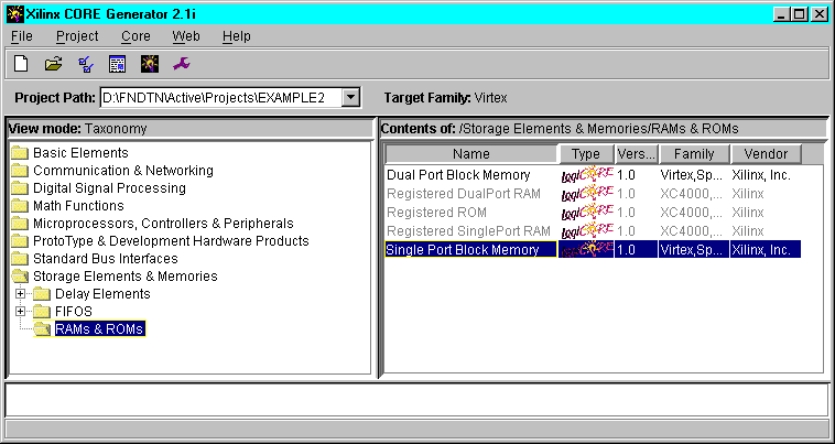 LogiBLOX modules may be generated in Foundation and then instantiated in the VHDL or Verilog code. This flow may be used for any LogiBLOX component, but it is especially useful for memory components such as RAM. Never describe RAM behaviorally in the HDL code, because combinatorial feedback paths will be inferred.