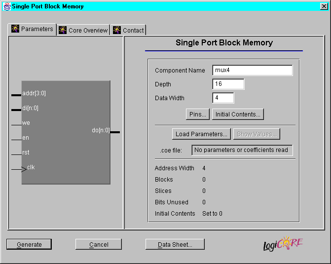 component_name.vei | Instantiation template used to add LogiBLOX module into your Verilog source code | |