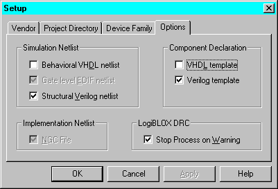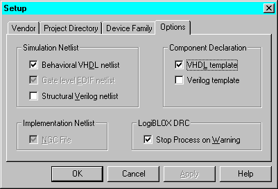LogiBLOX provides a template tool for generating the VHDL or Verilog component declaration statement.